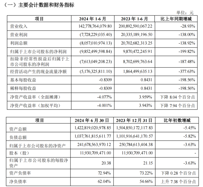 今年上半年,房地产行业仍处于下行区间。面对严峻的市场形势,万科夯实业务根基,筑牢安全防线。报告期内,万科实现销售金额1273.3亿元,销售金额在14个城市排名第一,在14个城市排名第二,在9个城市排名第三,持续保持在行业第一阵营。二季度以来,万科的月均销售额保持在200亿元以上,回款效率持续领先,回款率超过100%。同期万科实现营业收入1427.8亿元,归属于上市公司股东的净利润亏损98.5亿元。亏损原因主要包括房地产开发项目结算规模和毛利率的明显下降,按照审慎原则对部分项目及应收款项计提减值,部分非主业财务投资出现亏损,以及部分大宗资产交易和股权交易的亏损。