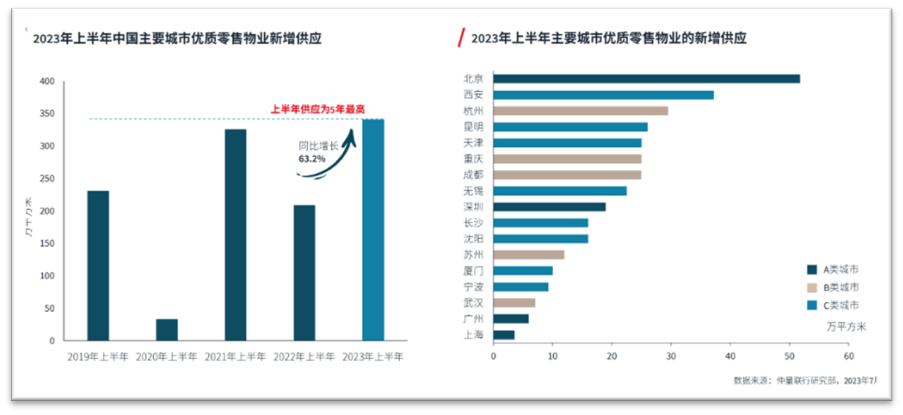 供应端,上半年零售物业新增供应约350万㎡,较2022年上半年同比增长63.2%,新增供应量同比为近五年之最,其中北京、西安、杭州供应领衔,存量方面上海、北京、成都领衔。
