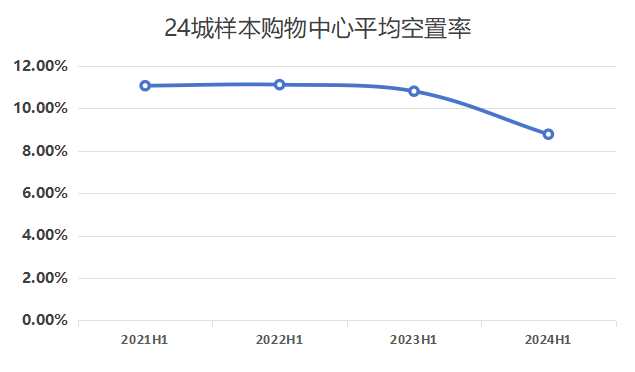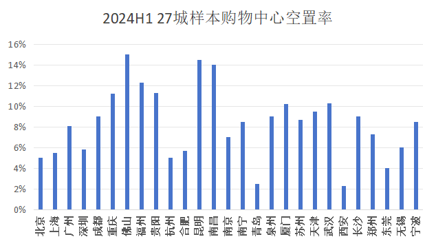 将分析范围扩大到城市层面,2024年上半年,在全国重点27城的600多个样本购物中心中,近半数城市的空置率环比上升,15个城市的空置率高于27城的均值。