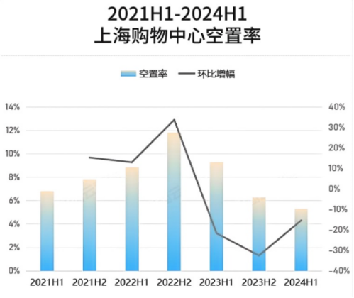 自2022年下半年以来,上海购物中心的空置率持续下降。截至2024年上半年,环比下跌超15%,在一线城市中降幅最大。其中,市级商圈购物中心的空置率为5.93%,区域商圈购物中心的空置率为4.22%。