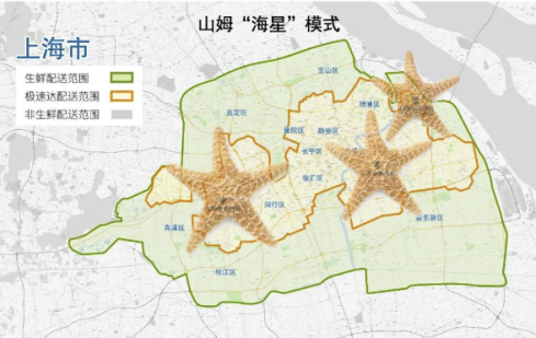 山姆模式以 “大店 + 前置仓” 的海星模式进行业务拓展。山姆中国目前已开出近 50 家大店以及 500 家前置仓,年营业超过 800 亿元,线上占比 50%。大店平均经营面积在 2 万以上,前置仓平均经营面积在 500 平方以内。