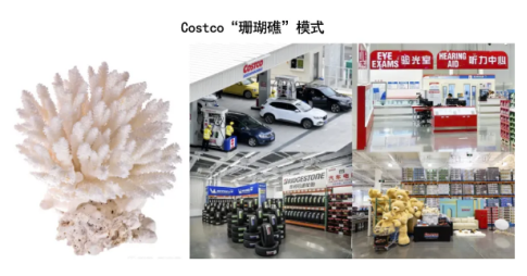 而除了店与包装 “大” 外,Costco 特有的 “3T” 经营理念 “试吃 Taste,触摸 Touch,带走 Take” 让消费者可以对商品有更多的认知,也减少了售后退货的风险。除此之外,是它丰富的品类和服务,从黄金饰品到名表包包,从眼镜化妆品到雨刮器轮胎,既有听力中心,更有自助加油站。从某种程度上看,Costco 模式更像 “珊瑚礁” 模式,每个单店都是一个生态系统,满足会员的多重需求。